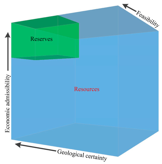Volumetric method in resource appraisal [56]. (a) the “blue cube” represents “Resources”; (b) the “green cuboid” represents “Reserves”; (c) the “arrows” indicates an increase in each element.