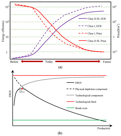 The economic evaluation of production considers the problem of coordination between input and output, technology and efficiency. One of the main purposes of developing MGHs is to maximize the economic benefit by using suitable technology in a safe environment. The two important parameters involved in the economic evaluation are the energy efficiency ratio (EER, ratio of combustion heat to decomposition heat in unit) and the energy return on energy invested (EROI, ratio of energy output to energy input during production) [70]. On the one hand, EER is affected by the production method, with the depressurization having the maximum energy efficiency; on the other hand, the reservoir type (Section 3.1.1) is also an important factor. The changes in reservoir energy efficiency and expected production cost trends are shown in Figure 14a. EROI is mainly influenced by the technical level and the amount of resources used during production. Generally speaking, the higher the resource value used, the higher the hydrate production efficiency that can be achieved. The continuous improvement in technology and constant consumption of resources indicates that the EROI has a peak value Qmax and then declines to the breakeven line (Figure 14b). Therefore, low-efficiency technology will inevitably consume large amounts of high-quality resources and shift the peak forward. One of the important uses of economic evaluation of the production costs associated with technological breakthrough and innovation is to ensure that these lie within a reasonable range on the EER and EROI graphs [71,72].