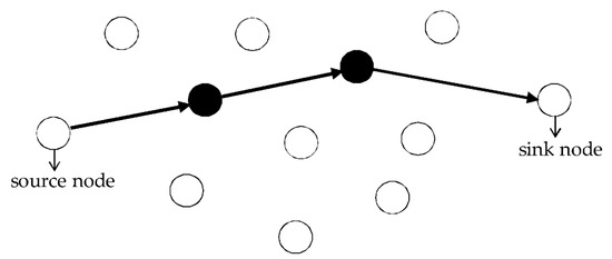 In this study, a fuzzy-based algorithm is adopted to solve the uncertain characteristics of energy consumption in a WSN. A schematic picture of a WSN is provided in Figure 1, in which sensor nodes are expressed as circles in the WSN. Let the target sensor node represent the source node. Many paths can be chosen to transmit a signal from the source node to the sink node each node is expressed as a circle in Figure 1. For example, one chosen path sends the signal from the source node to the sink node through two linking sensor nodes which are dark colored in Figure 1.