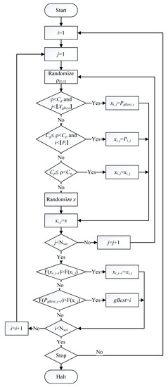 where the number of generations is denoted as t, t = 1, 2, …, Ngen; the number of solutions is denoted as i, i = 1, 2, …, Nsol; the number of variables is denoted as j, j = 1, 2, …, Nvar; xt,i,j and xt−1,i,j are the ith solution of the jth variable at generations t and t − 1, respectively; PgBest,j and Pi,j are the jth variable of the temporary global best of all solutions and the temporary personal (local) best of the ith solution, respectively; ρ belongs to uniform distribution [0,1]; Cg = cg, Cp = Cg + cp, Cw = Cp + cw; x belongs to uniform distribution [li, ui].