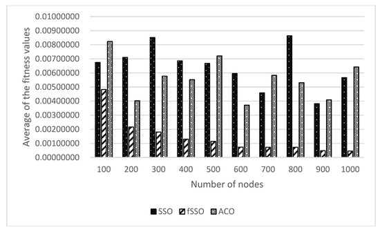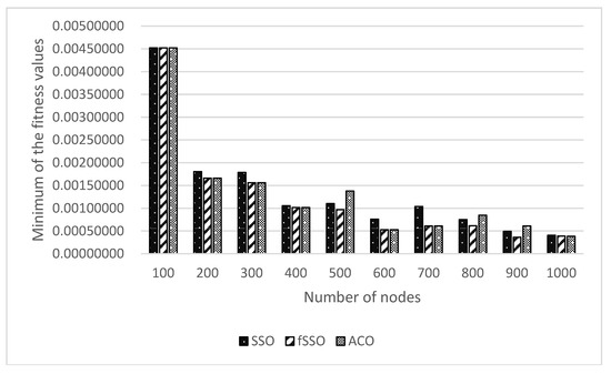 - According to Table 12, the configuration of 500, 800 and 900 sensor nodes in a WSN has the best solutions of minimum fitness values obtained by the proposed fSSO compared with those found by SSO and ACO for the proposed multi-objective problem including energy consumption, cost and signal transmission quantity.