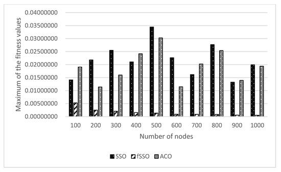 - According to Table 13, Table 14 and Table 15, the configuration of ten benchmarks of 100, 200,…, 1000 sensor nodes in a WSN has the best solutions of maximum, average and standard deviation of fitness values obtained by the proposed fSSO compared with those found by SSO and ACO for the proposed multi-objective problem including energy consumption, cost and signal transmission quantity.