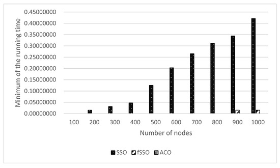 - According to Table 16 and Table 17, the configuration of ten benchmarks of 100, 200,…, 1000 sensor nodes in a WSN has the best solutions of minimum and maximum running time obtained by either the proposed fSSO or ACO compared with those found by SSO for the proposed multi-objective problem including energy consumption, cost and signal transmission quantity.