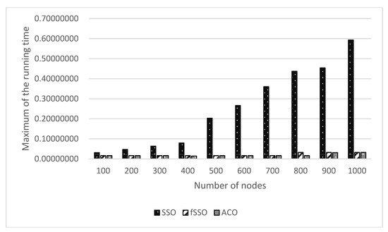 Maximum of running time of fSSO compared with SSO and ACO for ten benchmarks.