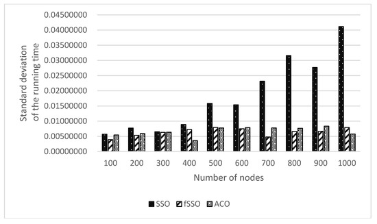 Moreover, statistical analyses of the minimum, maximum, average and standard deviation of the running time from the ten benchmarks are displayed in Figure 11, Figure 12, Figure 13 and Figure 14, where the x-axis and y-axis are the related running times based on CPU seconds for each benchmark. The best solutions of the minimum, maximum, average and standard deviation among the ten benchmarks are indicated in bold in Table 16, Table 17, Table 18 and Table 19. From Table 16, Table 17, Table 18 and Table 19, performance of running time obtained by the proposed fSSO compared with those found by SSO and ACO in the WSN is concluded as follows: