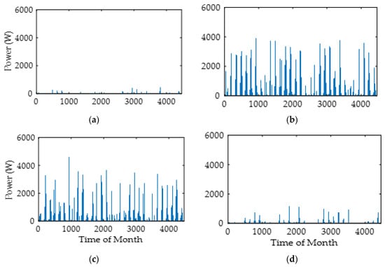 Figure 3 depicts the PV generation in different seasons obtained using Equations (1) and (2). According to the PV generation profiles, the capacity factors of PV for the winter, spring, summer, and autumn seasons were 0.438%, 17.14%, 14.82%, and 1.824%, respectively.