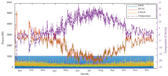 The proposed model was simulated for all seasons under strict comfort requirements, i.e., ambient temperature and DHW temperature were maintained at 21 °C and 60 °C, respectively, for all 4464 time slots. The disaggregated annual loads calculated using Equations (3)ߝ(5), along with the temperature profile, are illustrated in