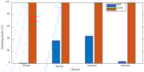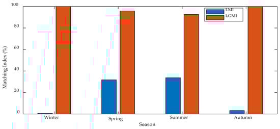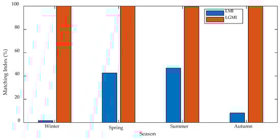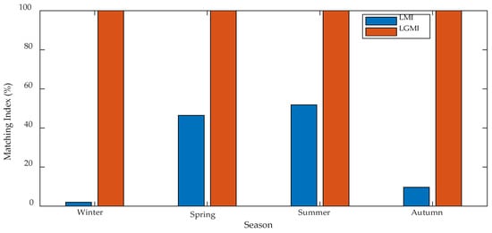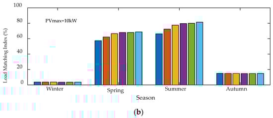 Figure 7. The improvement in the indices was substantial in the case of spring and summer seasons. Indices for summer and spring were improved due to high PV productions in these periods. The improvements in LMI were 18.05% and 33.51% for the spring and summer seasons, respectively. However, there was also a slight improvement in LGMI for these two seasons. The LMI improvements in the other seasons were not significant due to very low PV production. It is worthwhile pointing out that the proposed objective function targeted both matching indices since both of them improved in comparison to the first case.