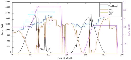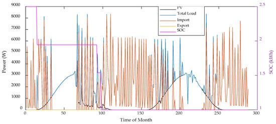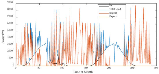 Figure 4). It can be seen that total load was perfectly matched with PV production for some time slots. At times when there was no PV generation, the imported power was equal to the total load, which is visible in