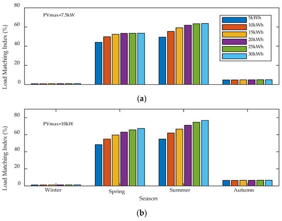 Figure 12, the effects of increasing the storage size from 5 kWh to 30 kWh, with 5 kWh steps, on the LMI for two different PV ratings of 7.5 kW and 10 kW are shown. For both PV capacities, in the spring and summer seasons, the LMI generally improved with increasing the storage capacity. Moreover, it can be seen that, in the spring season for the PV