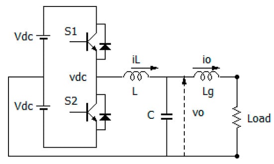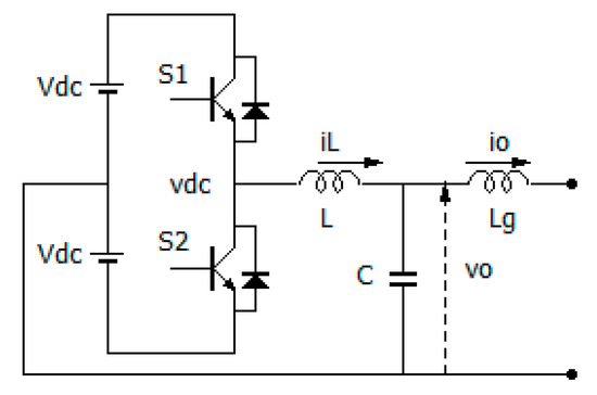 Consider a half-bridge inverter circuit, which has two constant and balanced DC sources as shown in Figure 2. Each of the DC sources has a voltage of . Parameters , , and represent the capacitance of the hysteresis current filter, the output inductance, and the grid-connected inductance, respectively. Assume that the output current of the inverter needs to be controlled to track a specified reference current . The digital controller uses data from voltage and current sensors sent through analog/digital converters to calculate the on/off pulses of the switches and .