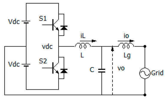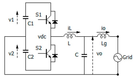 In the grid-connected mode, the output of the inverter is connected to the grid directly as shown in Figure 5. The inverter converts a given electrical power from the DC sources into AC power and supplies it to the grid.