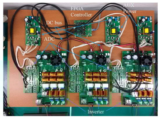 The proposed control algorithm has been assessed by using a prototype of the DGR composing of three inverters as shown in Figure 7. Each inverter in the DGR has a rated power of 300 W. The inverter circuit has the parameters given by: , , and . The analog/digital converter (ADC) has the sampling frequency of 4 MHz and the output data is at 12 bit. The constant switching frequency in the adaptive hysteresis current control is at 20 kHz. The proposed control algorithm is implemented on an FPGA-based digital controller, which is used with the clock frequency of 160 MHz.