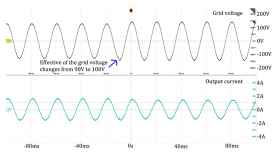 Responses of the grid-connected inverter when the grid voltage changes its effective value from 90 V to 100 V.