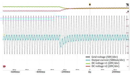 Consider a DGR composed of the same three multi-functional inverters with a common DC bus as shown in Figure 7. In the back-to-back system, the DGR is connected to two separate power grids. The first inverter is operated in the master mode. It is connected to a power grid , which has an effective voltage value of 100 V and frequency of 60 Hz. This inverter is controlled to maintain the voltages of the common DC bus at 175 V.