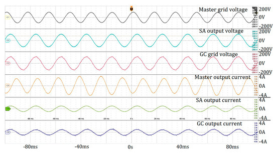 Figure 14 shows the voltage and current responses of the master, stand-alone (SA), and grid-connected (GC) inverters respectively. The stand-alone inverter is shown to supply a voltage which matches the reference voltage almost exactly and consume a power of 100 W for the load. The grid-connected inverter transfers a power of 100 W to its grid while the master inverter receives a power of 200 W from the other grid to retain the voltages of the DC bus at 175 V. The three inverters are shown to yield stable responses and fulfill their roles almost exactly. It allows the DGR to connect to various power sources asynchronously and control the power flow smoothly.