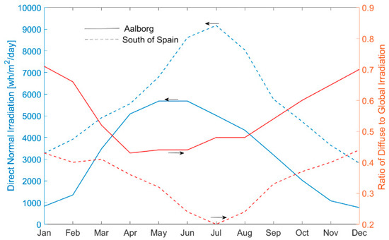 The Joint Research Centre, which is the commission’s science and knowledge service, provides an online database of environmental data related to renewable energies [25] exploited in this study. Two places in Europe with different insolation and temperature regimes were selected: Aalborg (57°2′11″ N, 9°55′21″ E) in the North of Denmark, which is mostly cloudy with diffused isolation and 7–18 daylight hours. The second location is Gibraltar (36°19′36″ N, 5°37′29″ E), which has more direct radiation and 10–14 daylight hours. This selection was based on a diffused to direct ratio of sun isolation (see Figure 1) in order to compare the STEG and concentrated CHP. The values of direct, diffused, and total irradiance in Aalborg and Gibraltar are shown in Table 3, according to which the diffused irradiance in Aalborg was 19% higher compared to Gibraltar. However, global irradiance was 21% lower.