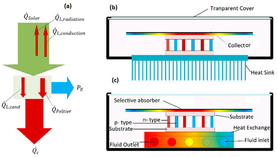 The energy flow is shown in Figure 2a. The sun irradiance is absorbed by the selective absorber, passes through the collector plate, and then flows through the thermoelectric legs (Figure 2b). The thermal concentration, the ratio between the collector , and TEG surface areas are above 100, which causes high temperature and radiative losses . Vacuum insolation can minimize conductive losses . Moreover, the thermal conductivity in a typical vacuumed solar collector is in the order of . In Figure 2b, the dissipated heat rejects to ambient. Meanwhile, the rejected heat is an input of the heat for the CHP system, presented in Figure 2c. Energy balance equations of the system are, as follows: