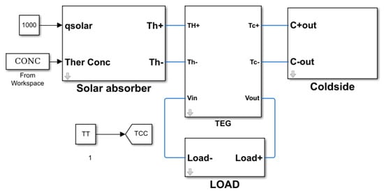 In the Simulink view, the solar absorber acts as a current source, controlled by absorber temperature, radiation intensity, and the system dynamic. The cold side was considered as a controllable voltage (temperature) source, and the electrical load block as a controllable resistor. In the case of maximum electrical efficiency, the load’s resistance should be equal to the TEG’s internal resistance.