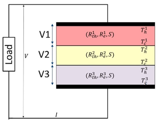 Peltier’s, Seebeck’s, and Ohm’s laws are governing equations for TEG devices. By dividing TEG into stacked blocks, temperature-dependent material properties can be used. In this approach, the TEG is divided into several thin TEGs, which are thermally and electrically connected in series. The output of each block is an input for the next block. Due to only small temperature differences along each block, it is possible to assume that temperature is constant and use locally constant temperature-dependent materials’ properties. Figure 4 shows a schematic of this method.