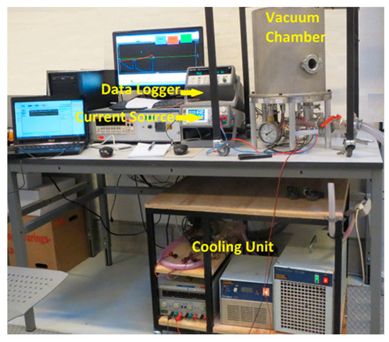To obtain the module properties and validate the model, a sample module was tested by Tegeta at the Aalborg University [31]. This setup was designed initially to characterize high temperature oxide materials [31], and it was modified for the mid temperature module studied in this paper. Figure 5 shows the modified setup in which the ceramic heater is replaced by a ULTRAMIC 600 supplied with Keysight B2900 to maintain the hot side at the desired temperature. T-type thermocouples, with a diameter of 50 micrometers and a nominal response time of 20 milliseconds sense temperatures. The Keysight 34972 logged data every 10 s. The second channel of the Keysight B2900 was used to run constant reverse voltage and emulate the electrical load. Silicon thermal past is used between layers to ensure low thermal resistance between the hot side and TE module as well as the module and heat sink. The measurement was run over different temperatures, and all data was stored in a text file then imported to a Microsoft Excel spreadsheet for further analysis. The standard procedure to characterize TE modules was: set constant temperature and electrical load until thermal and electrical stability was achieved then log the corresponding data for each electrical load. The data was processed later to fit the output power versus electrical load. The corresponded electrical load of maximum output power is the internal electrical resistance of module.