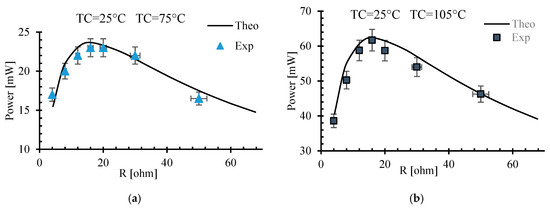 Figure 6 shows the measured and calculated power module at two temperature differences between hot and cold sides. The mismatching between calculated and measured electrical resistance is due to sidewall thermal losses, and it is increased by increasing the average temperature, comparing between Figure 6a,b. However, the difference is acceptably less than 10 percent of the total power [34]. This proves that the model can represent a real system with an acceptable error.