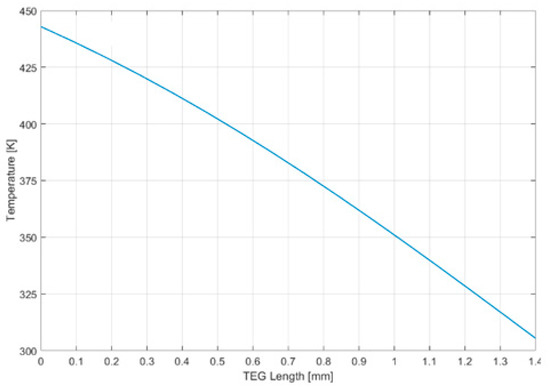 The temperature distribution along the heat conduction direction in the TEG module is shown in Figure 7. Due to different heat transfer mechanisms, the temperature distribution along the TE elements is not linear. In order to have a faster simulation, the thermal mass of the solar collector was eliminated from the simulations. It is worth noting that the long response time of the TEGs is an advantage that causes higher stability in power generation systems, thereby diminishing the necessity of fast MPPT [35] algorithms and providing an intrinsic storage capability for the system. According to Table 2 and Table 5, the STEG time constant mostly depends on the solar thermal collector. For instance, a 1 change in thick copper takes 17 s when radiation is 1000 .