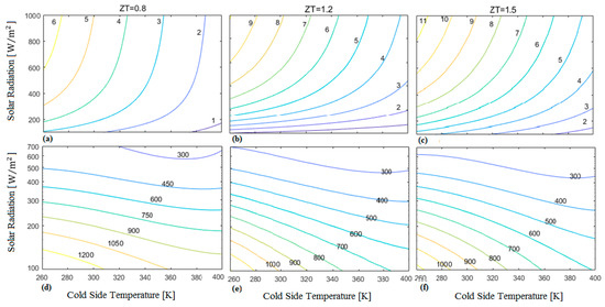 Figure 8 exhibits the maximum STEG efficiency (a–c) and optimum TC (d–f) contours at different terrestrial conditions for various ZT values. Higher radiation intensity at constant cold side temperature increases the efficiency and decreases the corresponding TC, whereas an increase in the cold side temperature leads to a reduction in both efficiency and the corresponding TC, which is not a desirable condition. The opposite effects of air temperature and solar radiation intensity cause the relative efficiency in winter and summer days. For example, two different conditions in summer () and winter (), have an equal efficiency of 4.8% for ZT = 0.8 and different values of TCs. Therefore, it is necessary to perform long-term optimization instead of only STC condition optimization. While the module with higher ZT increases efficiency, it simultaneously decreases TC. Incensement in ZT is due to the lower thermal conductivity of TE materials, which may lead to the manifestation of optimum temperature gradient at lower TC. For example, increasing ZT from 0.8 to 1.2 leads to the decrease of TCs at and by order of 200 and 110, respectively.