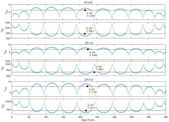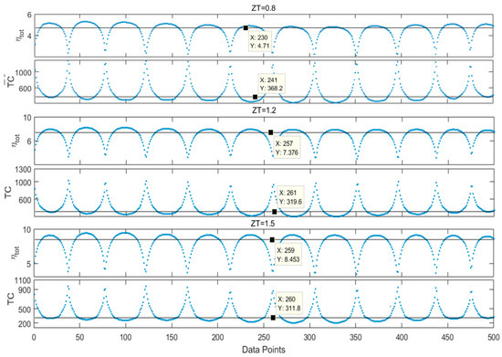 Figure 9 and Figure 10 show how the optimum efficiency and TC can vary according to the terrestrial parameters, which confirms the necessity of yearly design optimization. Each blue dot in the figures refers to one data point. As observed, points with high values of TC were in early mornings or late evenings. Table 6 shows the daily energy production expectation for different values of ZT in comparison to the parabolic trough, which is a mature CHP technology with an average efficiency of 12.5% that can only capture DNI. Due to the higher amount of diffused radiation in Aalborg (49%), the increased ZT had more of an impact on energy production, compared to Gibraltar where diffused radiation is 33%. The parabolic trough can capture 67%of sun rays. STEG with ZT = 0.8 can generate 70% of the expected electrical power of the parabolic trough, and it could increase to 106% and 121% with ZT of 1.2 and 1.5, respectively.