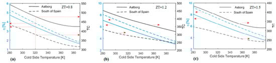Maximum efficiency and corresponded TC for different values of ZT (a–c) in the case where cold side temperature is constant.