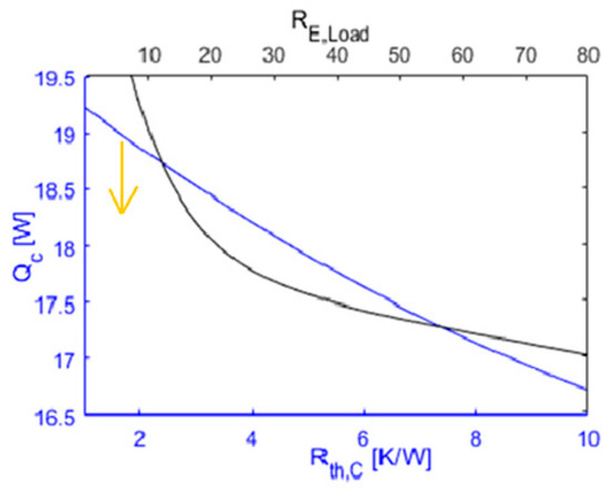 According to the results, higher TC had better efficiency in the early morning and late noon due to higher energy flux. Meanwhile, lower TC provided more efficiency at noon because of lower heat losses. The results showed that the optimum point of TC was between these two values. There are two parameters with the ability to regulate the electricity generator and rejected heat at cold side: (i) electric current, which can be referred to as electrical load resistance, and (ii) cold side thermal resistance, which can be recognized as a volumetric flow of heat exchanger fluid. Due to the Peltier effect, the electric current variation exerts an impact on the thermal conduction. Figure 12 exhibits the variation of the load resistance from 0 (short circuit) to 80 ohms (open circuit), causing a 17.5% change in dissipated heat at the cold side of TEG. It means that when the solar radiation variation is below 17.5%, the water temperature can be regulated. Reversely, the output power can be kept constant by controlling the water flow of the heat exchanger.