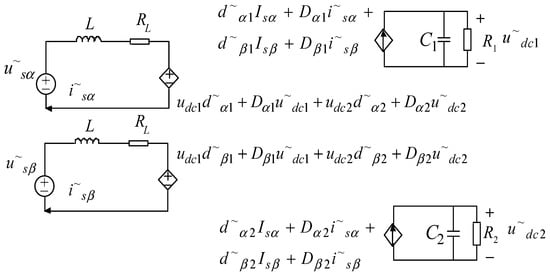 To simplify analysis of system stability, according to Equation (1), a small-signal model of the stationary reference frame (αβ frame) was built, as illustrated in Figure 2. Here, usα equals us, and usβ is the orthogonal signal of us; u~sα and u~sβ represent the small-signal ac variation of usα and usβ; u~dc1 and u~dc2 denote the small-signal ac variation of udc1 and udc2; isα equals isa, and isβ is the orthogonal signal of isa; i~sα and i~sβ represent the small-signal ac variation of isα and isβ; Isα and Isβ stand for the quiescent operating point of isα and isβ; Dα1, Dα2, Dβ1, and Dβ2 are the duty cycles of the first and second H-bridge; and d~α1, d~α2, d~β1, and d~β2 represent the small-signal ac variation of Dα2, Dβ1, and Dβ2.