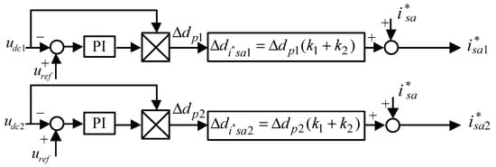 The presented voltage balance controller is shown in Figure 5, which modifies the duty cycles of each ac current reference i*sa1 and i*sa2 individually to reduce the dc voltage imbalance. The current reference for each H-bridge can be calculated according to Equations (8)–(10):