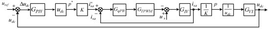 Assume that the parameters of the H-bridges are identical, such that the dc-link voltage udc1 = udc2 = udc. The double-loop control diagram presented in Figure 6 can thus be transformed as illustrated in Figure 8. In Figure 8, GV is the voltage gain of CHB, GPIV is the voltage PI regulator, K is the conversion coefficient between p* and i*sa, GqPR is the current PR regulator, GTPWM is the transfer function of the PWM modulator, GIV is the transfer function of the voltage to output current i*sa, and GVI is the transfer function of the current to output voltage udc. GIV and GVI can be deduced from the small-signal model shown in Figure 2.