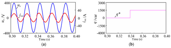 Figure 12b shows the ac side five-level staircase voltage. Dynamic responses of the proposed method under sudden reactive power change conditions are shown in Figure 13 and Figure 14. In these, the active power reference p* is governed by the outer power loop, and the reactive power reference q* is changed from 0 to −1500 var and 0 to 1500 var at 0.34 s.