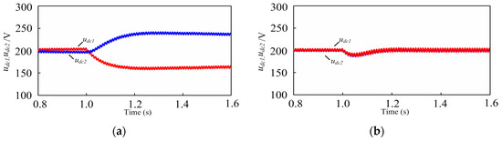 In this simulation, the initial loads of two H-bridges were 15 Ω resistors. At 1.0 s, the resistor of the first H-bridge declined to 10 Ω. Two distinct cases were considered. In Figure 15a, the voltage balance control module was not utilized, and the dc-link voltages became different after the load change. The second H-bridge, whose resistor was unchanged, demonstrated higher dc-link voltage than the first H-bridge. Figure 15b shows the dc-link voltages with the voltage balance control method. Using the proposed voltage balance control module, the dc-link voltages returned to the initial value (200 V).