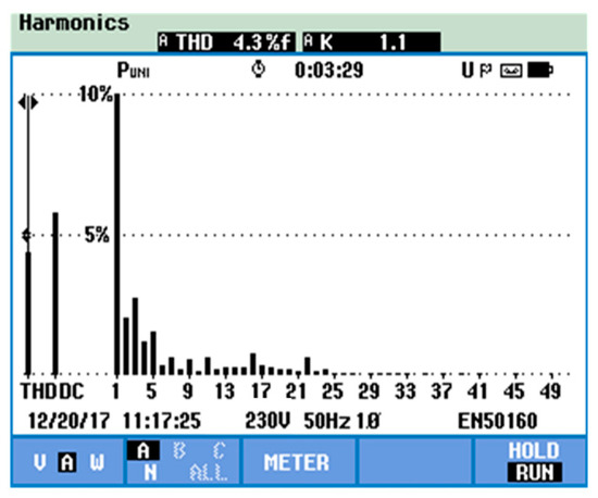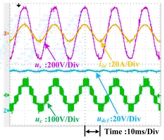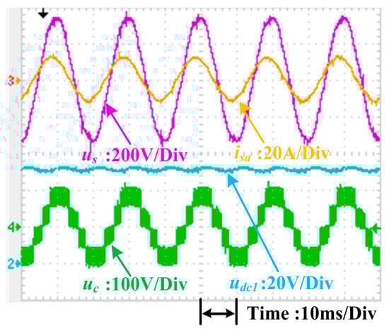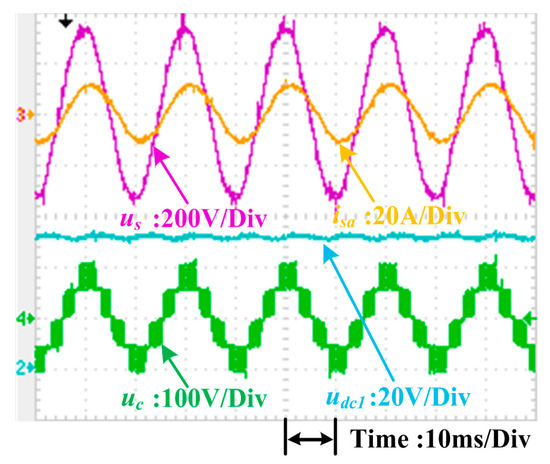 Figure 17 depicts the experimental waveforms of the grid voltage us (200 V/division), the grid current isa (20 A/division), the dc-link voltage of the first H-bridge udc1 (20 V/division), and the ac side voltage uc (100 V/division) for the proposed scheme in the steady state, where loads R1 and R2 in Figure 1 are 10 Ω and 15 Ω, separately. When the reactive power reference q* was set to zero, the grid current was in phase with the grid voltage, so the unity power factor was achieved. The THD of the grid current in the steady state was 4.3%, indicated in Figure 18. Moreover, this method was found to compensate for the reactive power: CHB converters can generate or absorb reactive power to the power grid when the reactive power reference is positive or negative. In Figure 19, the grid current was leading the grid voltage; thus, the CHB converter was generating reactive power to the system. In Figure 20, the grid current was lagging the voltage, and the CHB converter was absorbing reactive power from the system.