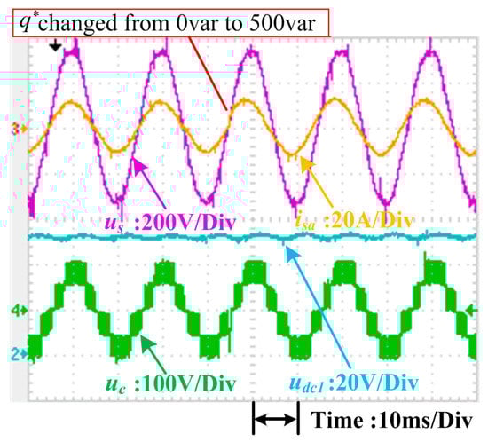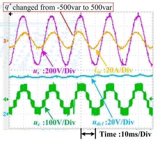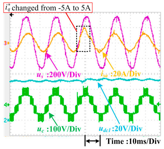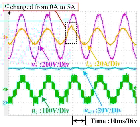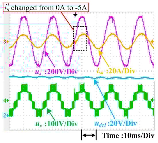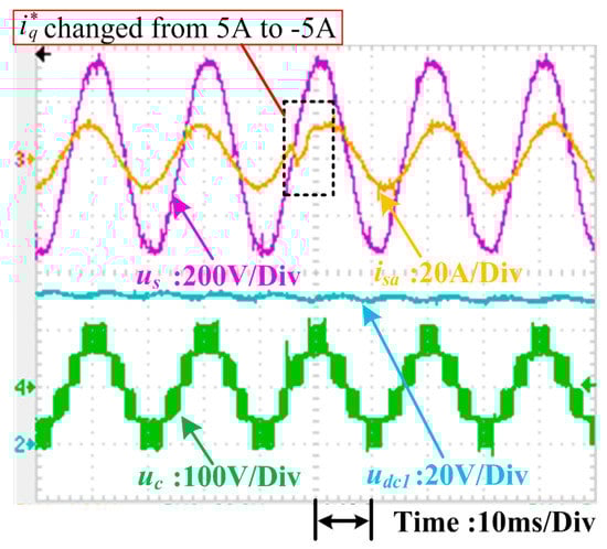 Currently, the most popular control method for the single-phase CHB converter is dq control. Several experiments were carried out to compare conventional dq control with the proposed control method. These experiments tested the dynamic responses of the systems under sudden power change conditions. In these tests, the total dc-link voltage udc_sum was kept at 100 V, and the system was connected to two resistive loads where R1 is 10 Ω and R2 is 15 Ω, respectively. The dynamic of the d-axis current i*d in the dq control was managed by the outer voltage loop, and active power p* in the proposed scheme was controlled by the outer power loop. Therefore, only step changes in the reactive current reference i*q in the dq control and reactive power reference q* in the proposed control were applied to evaluate the dynamic control performance of each. Differences in the dynamic performance of the dq control scheme and the proposed control method are illustrated in Figure 21, Figure 22, Figure 23, Figure 24, Figure 25, Figure 26, Figure 27 and Figure 28.