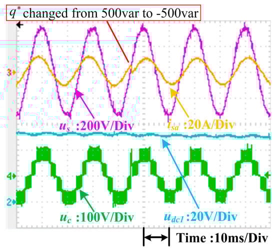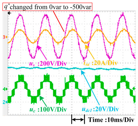 The total dc-link voltage udc_sum is 100 V; i*q and q* are given directly in each control method. Reactive power reference q* equals udc_sum * i*q (100 * i*q). For instance, when the step change of i*q is 5 A, the step change of q* equals 100 * i*q (500 var); when the step change of i*q is −5 A, the step change of q* equals 100 * i*q (−500 var).
