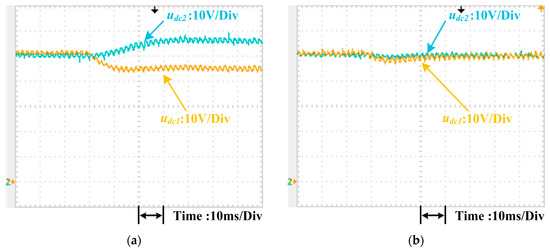 Unbalanced load experimental tests were conducted to verify the voltage-balancing performance of the presented scheme. In these experiments, the load resistor of the first H-bridge R1 was stepped from 15 Ω to 10 Ω whereas that of the second H-bridge R2 was maintained at 15 Ω. In Figure 29a, when the load resistors were changed, the dc-link voltage of the first H-bridge udc1 (10 V/division) declined from 50 V to 45 V, and that of the second H-bridge udc2 (10 V/division) increased from 50 V to 55 V. Figure 29b shows that when the voltage balance controller was adopted, the dc-link voltages could be controlled to 50 V when the load resistors were changed. Thus, the accuracy of the presented dc-link voltage balance control method was confirmed.