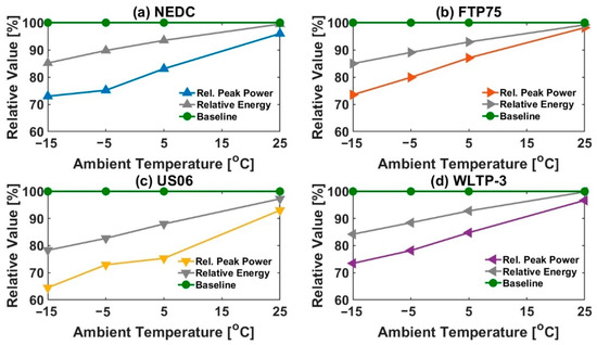 For example, for US06, while the relative energy delivered reduces from 97.25% to 78.31% as ambient temperature decreases from 25 °C to −15 °C, the relative peak power reduces from 93.03% to 64.50% (Figure 3c). For a particular legislative drive cycle, the relative energy and power demands for which a cell should be tested for is given relative to the ambient temperature (the ‘green’ line in Figure 3).