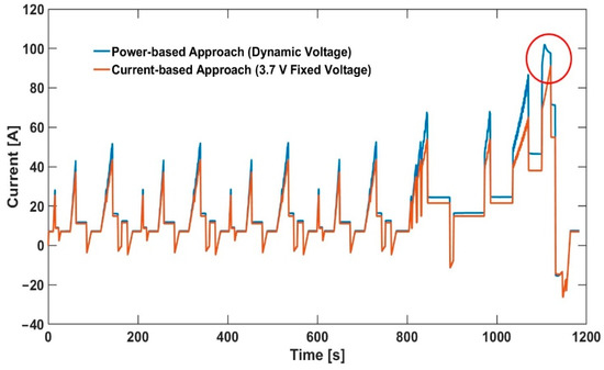 Comparison between current profiles for power-based approach and current-based approach for NEDC at −15 °C ambient temperature and 65% starting SOC.