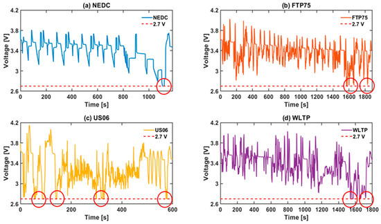 Effect of power-based approach on voltage response of legislative drive cycles at 65% starting SOC and −15 °C ambient temperature: (a) NEDC, (b) FTP75, (c) US06 and (d) WLTP-3.