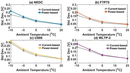In Figure 8, the standard deviation from mean cell voltage (σ) for power-based approaches are compared to the corresponding values for the current-based approach at different ambient temperatures and legislative drive cycles. It can be seen that σ increases as ambient temperature decreases for a particular legislative drive cycle. For example, for the FTP75 as ambient temperature reduces from 25 to −15 °C, σ increases from 0.04 V to 0.20 V (Figure 8b). Further, σ recorded a higher value for the more aggressive drive cycle. While for NEDC, σ increases from 0.04 V to 0.22 V; but the corresponding rise for US06 is from 0.06 V to 0.31 V (Figure 8a,c).