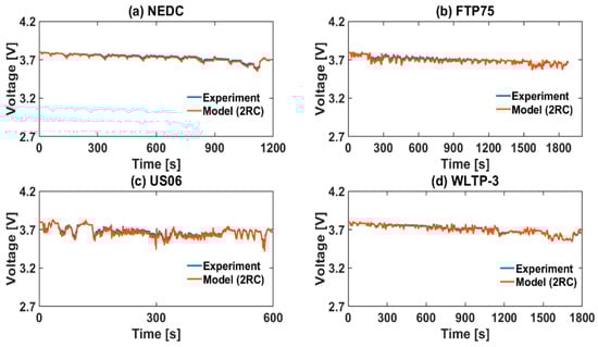 Comparison between experimental and modelling (2RC) voltage profiles for current-based approach at 25 °C ambient temperature and 65% starting SOC: (a) NEDC, (b) FTP75, (c) US06 and (d) WLTP-3.