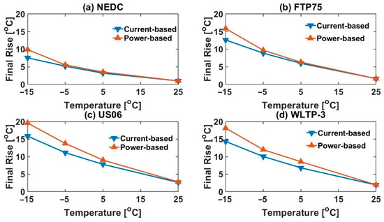Final operating temperature rise for both current-based and power-based profiles for different drive cycles at various ambient temperatures for 2nd order ECM: (a) NEDC, (b) FTP75, (c) US06 and (d) WLTP-3.