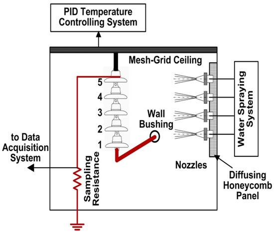 According to IEEE Standard 1783/2009, the experiments for ice shedding and flashover were carried out in the specified cold-climate room, the dimensions of which were 4.8 m × 2.8 m × 3.5 m. When the sample was installed, a cooling system could make the room temperature decline to −12 °C quickly, which was adjusted by a high-resolution proportional integral and differential (PID) system. When keeping the sample under the setting ambient temperature for more than 16 h, the AC power source energized the specimen at the voltage of 75 kVrms (15 kVrms per unit). Meanwhile, supercooled water droplets with the average radius of 40 µm were sprayed on the sample surface with the help of four pneumatic nozzles connected with the wind, which could be generated by a 10-fan system. Mixing deionized water with sodium chloride made the water conductivity be 30 µS/cm and the parameter could be measured by the digital conductivity meter. Besides, the mean wind velocity was set at 3.3 m/s.