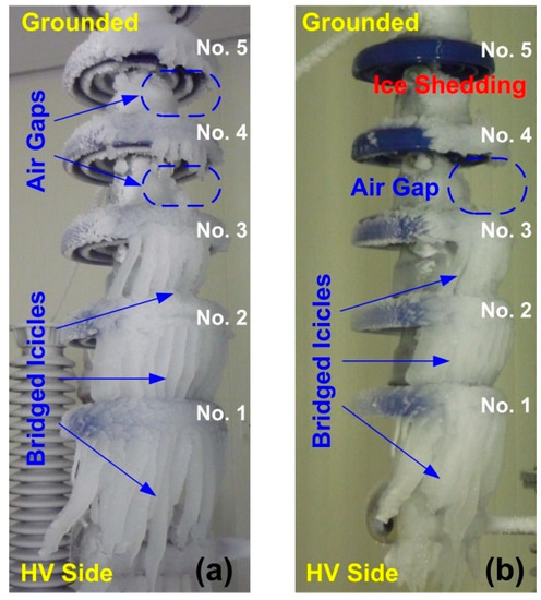 Surface condition of ice-covered outdoor insulators: (a) occurrence of ice shedding; (b) without the ice shedding.