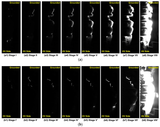 (3) At the stage of flashover: A white discharge arc can be observed to develop downward along the residual leakage distance and to join with discharge arcs, causing the rapid occurrence of flashover. The flashover arc shows the characteristics of a very bright white central core surrounded with discharges of the decreasing brightness. By comparing Figure 4(a8) with Figure 4(b8), the diameter and brightness of the flashover channel show enhanced properties in Figure 4(b8), which reflect that the flashover under the ice-shedding condition is much stronger and brighter than that without ice shedding. It indicates that although ice shedding can inhibit the initiation and propagation of partial discharge arcs to flashover, it may significantly damage the insulator due to the higher energy produced by the flashover.