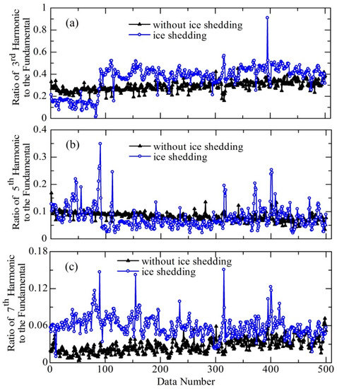 The ratio of harmonic components to the fundamental component can be attributed to the quantitative evaluation of the distortion level in the LC waveform, which responds to discharge behaviors related to a moderately high 3rd harmonic and successively smaller 5th and 7th harmonics [33,34]. Figure 6 presents the ratio of different harmonic components to the fundamental component of LC during the flashover process on the ice-covered insulator with and without ice shedding.